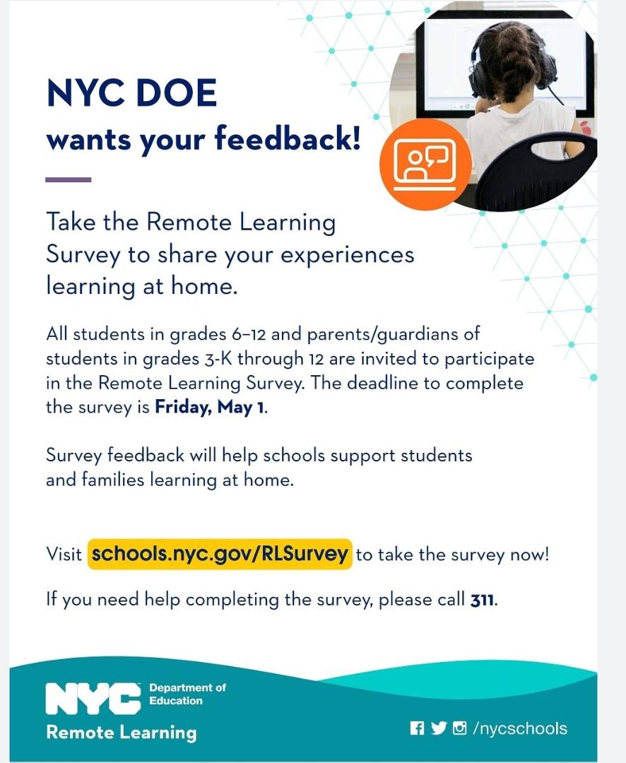 NYCDOE Remote Learning FeedbackDue by Friday, May 1 The DOE is looking for students and parents/guardians to share their experiences with learning at home. Let’s inform DOE’s evaluation of the transition to remote learning and its current implementation; the feedback will help direct DOE’s learning at home supports to students and families. All students in grades 6–12 are invited to participate; ALL parents/guardians are asked to provide their feedback. Visit schools.nyc.gov/RLsurvey to take the survey now! |